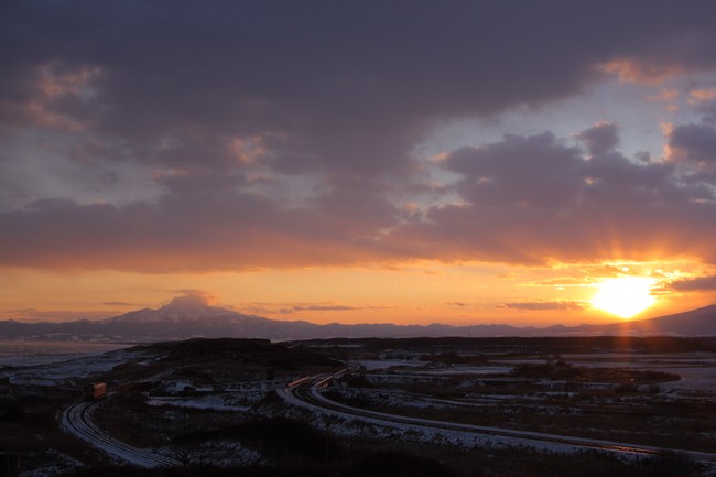 約10分後、下り釧路行きが通過するタイミングで、斜里岳の裾野辺りの雲間から日の出です。キハ54のボディが薄ら反射しました。正面は海別岳。