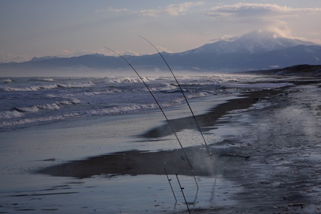 鮭釣りの竿が並ぶ海岸線。これも北海道の晩秋〜初冬の風物詩です。
