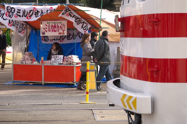 朝から屋台やってます。赤白帯の電車が新年らしい。