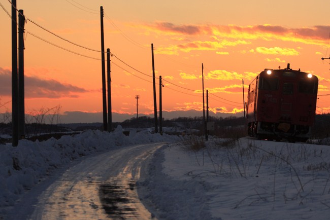 綺麗に焼けました。滝川からやってきた長距離普通列車。先頭はタラコ色。初日終了。お宿は釧路です。