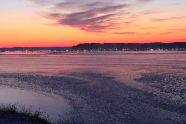 翌朝は5時出発。気温はマイナス18度とよく冷えてくれました。別寒辺牛湿原に向かう途中、日の出前、朝焼けの厚岸湾です。