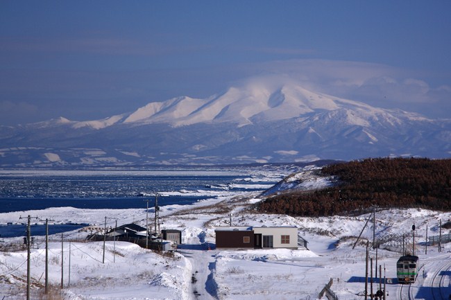 浜小清水の駅を発車する列車。「待たせたね!」と海別岳も顔を出してくれました。