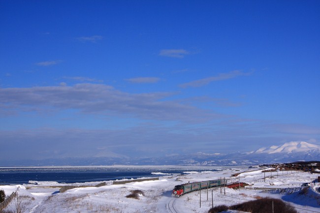 この季節、2往復ある「流氷ノロッコ」。緑から赤に変わったDEが雪に映えます。