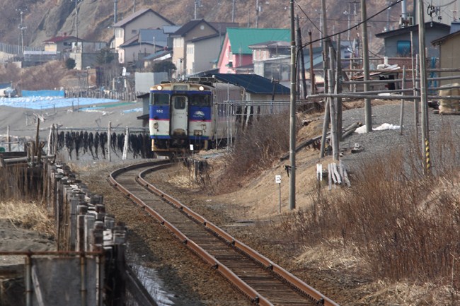 苫小牧から100キロ。この昆布乾しの浜辺りの風景は、被写体としての日高本線の象徴であると思います。