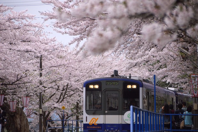 そして、能登鹿島駅。手入れの行き届いた、年季のある立派な桜が、ホームをトンネルのように包み込む。既に日が落ちてしまったのは残念ですが、桜もちょうど見頃です。もっと早い時間に来ればよかったな。