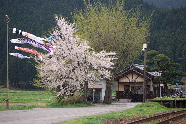 思いがけず、黒沢駅にも桜。鯉のぼりとセットで、いい光景。