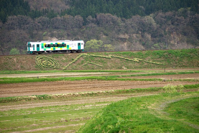 矢島に向かう築堤には、水仙で描かれた鳥海山!