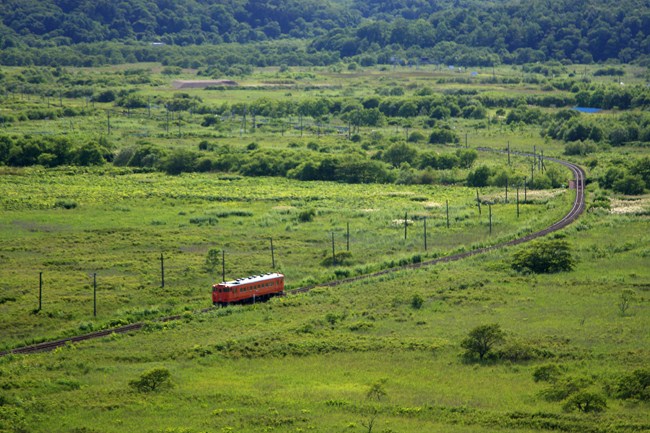 一気に南下して、根室本線、尺別の丘。眼下には、夏の濃い緑と朱色の気動車、絵になります。