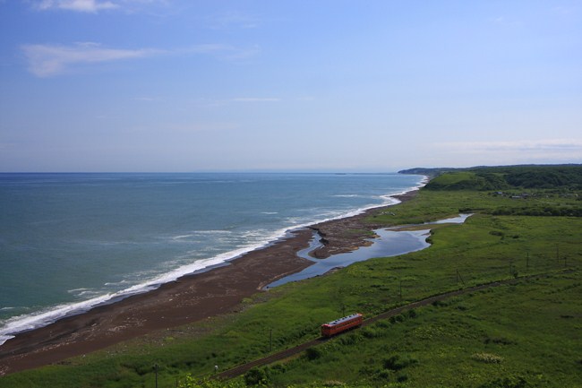 旅も2日目にして、初めてPL装着。青空と青い太平洋、緑の草原に、朱色の気動車は小さくとも存在感があります。心地よい風吹く丘から、とてもいい気分です。