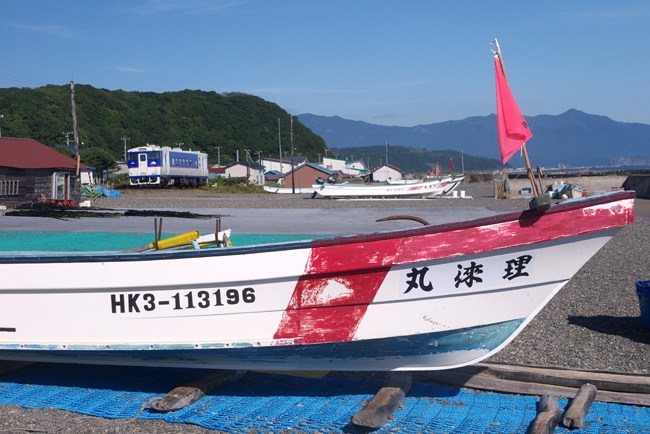 浦河まで来ると、馬を撮った後は「昆布乾しの浜」。お決まりのコースです。生憎午後の遅い時間であったため、昆布乾しは終わっていましたが、アポイ岳 がよく見えていました。
