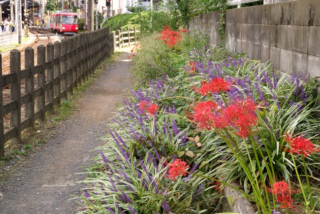 世田谷線の魅力の1つは、カラフルな車両。彼岸花と同色がやってきました。