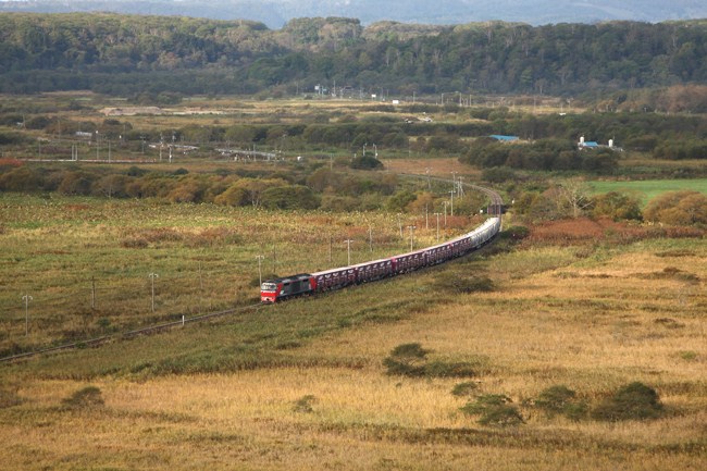 当地で、最も絵になる被写体は貨物列車。夏の深い緑も最高でしたが、秋の尺別海岸も味わいがあります。日が回ってきました。