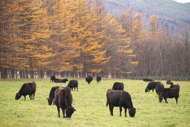 落葉松の林と牛のいる風景。十勝牛でしょうか‥。