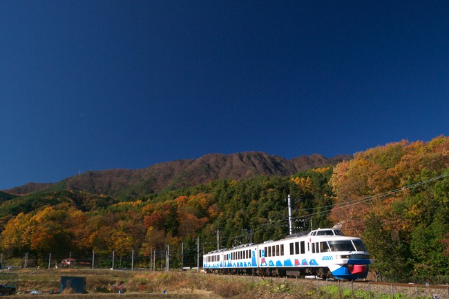すっきりした青空に、鮮やかな広葉樹の色づきを見せる山肌に沿って、颯爽とフジサン特急。撮るにも気持ちよく、気を衒わず素直に広角で。