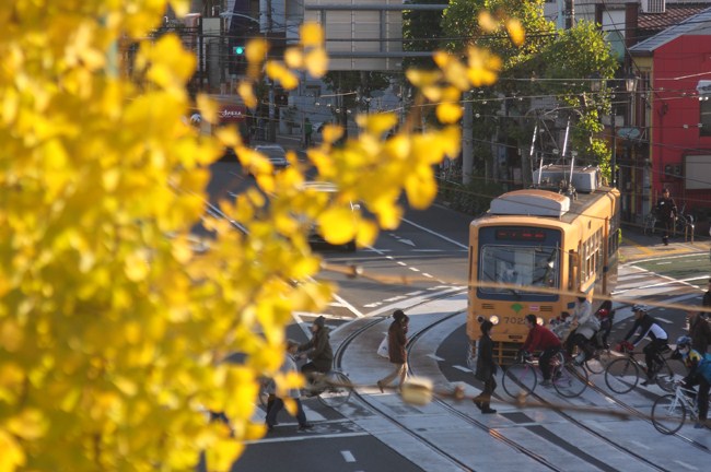 銀杏も、電車も、晩秋の日差しを浴びて。