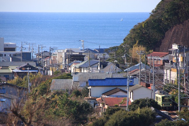 坂道を登れば冬の海。江ノ電がちょこっと顔を出しました。