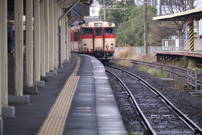 軍艦島から長崎に戻り、お昼は「ちゃんぽん」を戴いて、これから大村線で「ハウステンボス」に向かいます。某掲示板の運用情報では「国鉄色」キハ66の予想です。期待通り、佐世保行き「国鉄色」が入線です。久しぶりです、このカラー!