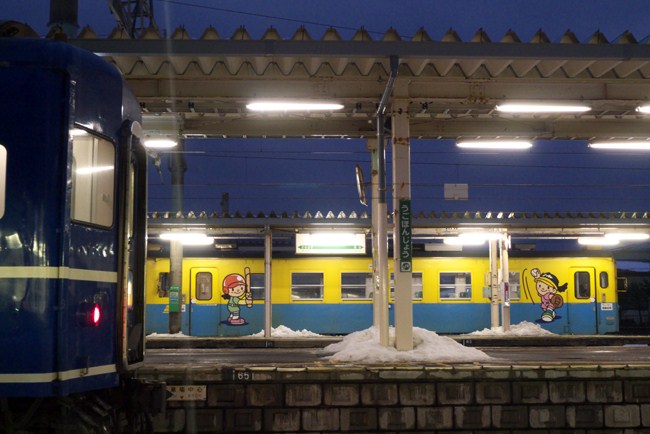大雪の影響で、あけぼのは羽後本荘で長時間停車。そのため、由利鉄始発列車との並びが実現しました。