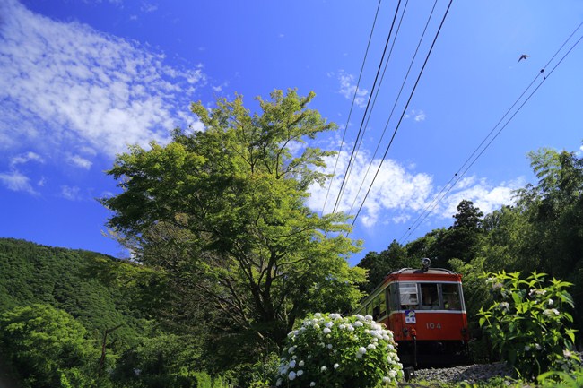 梅雨とは思えない、会心の青空。箱根登山鉄道では、珍しく開放感のある構図で撮りました。