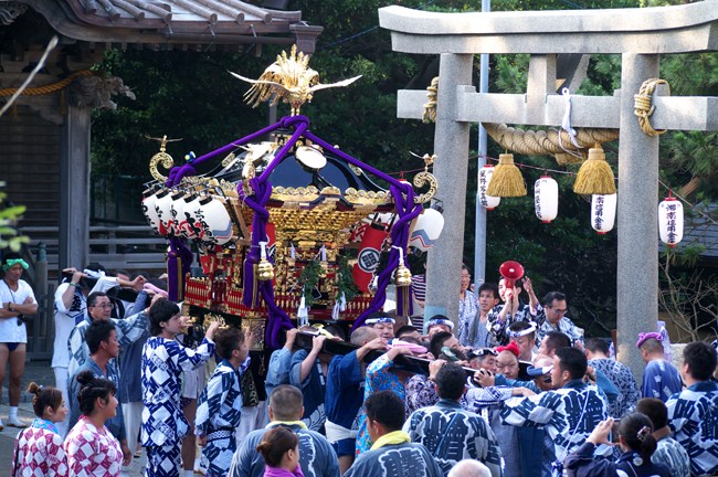 夕方、腰越の小動神社。少し涼しくなった頃、威勢の良い掛け声とともに、神輿が繰り出しました。