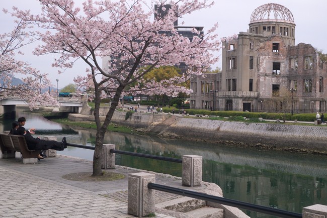 満開の桜と原爆ドーム、そして橋を渡る市電。