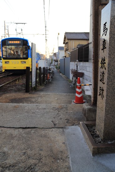 ホーム端に「馬車鉄道跡」。阪堺電車は100年を越す歴史があります。