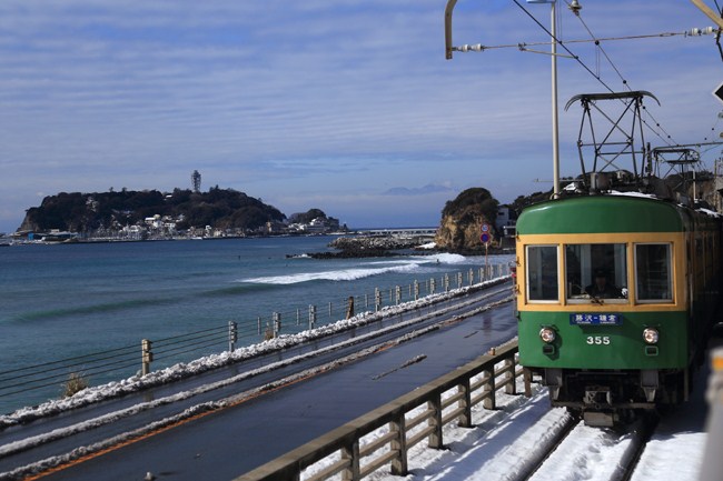 やはり、雪景色を撮るなら、ここです。下車して走って構えて、江ノ島バックに白い線路と300型。なんと、奇跡的に国道は車無しのすっきりシーンが撮れました!