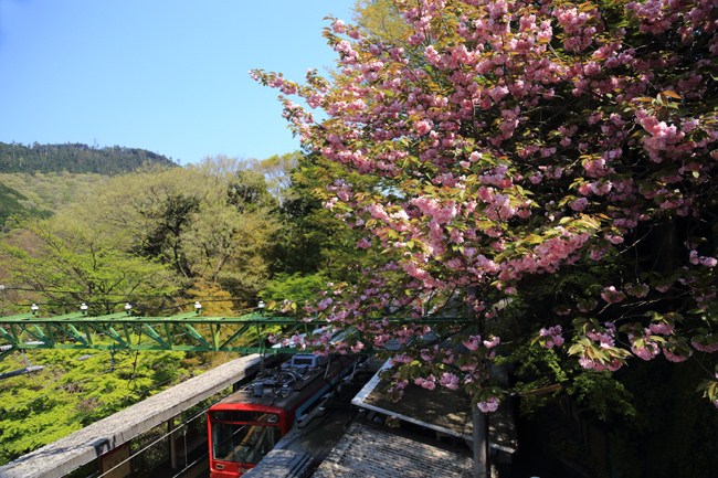 大平台駅には、溢れる新緑の中、大きな八重桜。