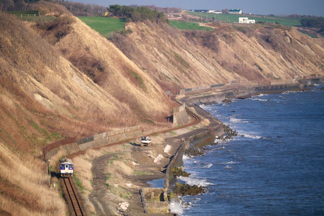 潮風が心地よい、高台から。単行気動車はゆったりと。渚に沿ってだんだん小さくなり、見えなくなるまで見送りました。