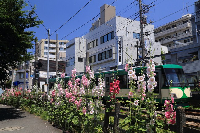 年々花が増えています。世田谷線のタチアオイ