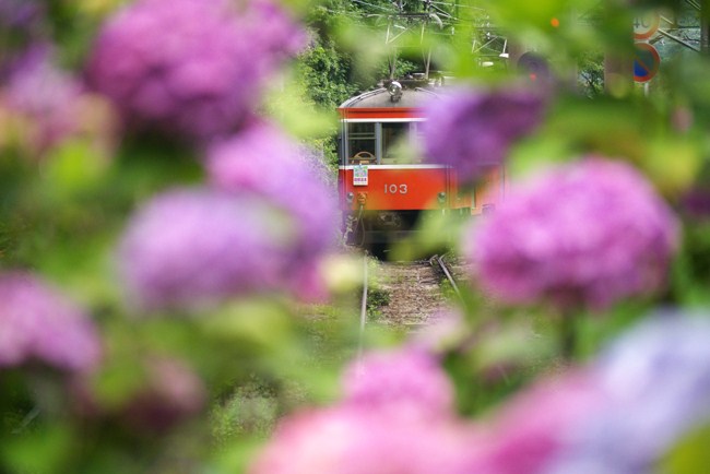 終点、強羅に向かう旧型を、紫陽花越しに。