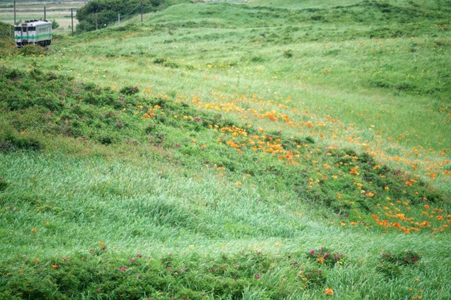 花の丘を行く普通列車。エゾスカシユリのオレンジに、ところどころハマナスの濃ピンクも見えます。これも夏の北海道。