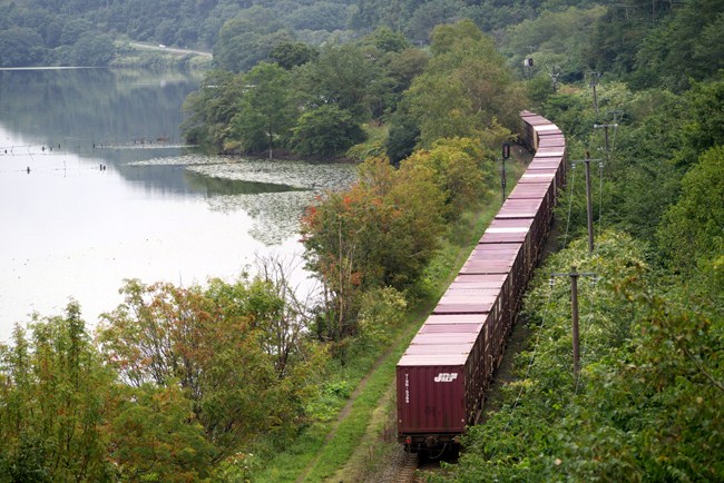 秋の気配が漂う小沼湖畔、DF貨物が通過します。