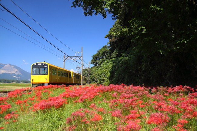 まずは、撮り始めの1枚。沿線の彼岸花は、例年だと10月初旬が見頃ですが、今年は秋の訪れが早かったせいか、やや見頃過ぎ。ギリギリ間に合った感じです。