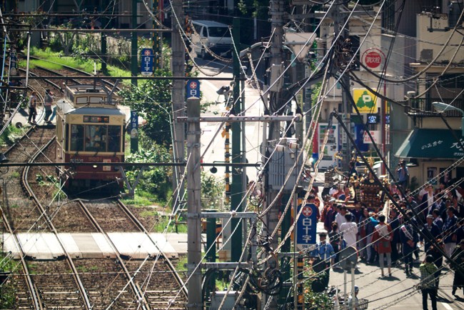 新しくできた駅ビルから、都電の線路が見渡せます。ちょうど、お神輿が踏切待ち。