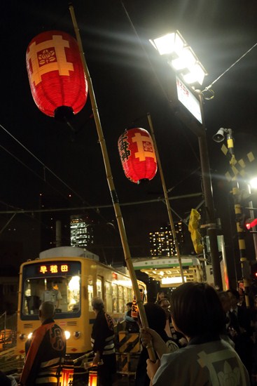 万灯行列の先頭が荒川線の踏切に差し掛かりました。