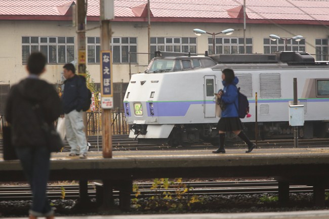 小雨の朝の苗穂駅。出発回送前の網走行きオホーツク1号。出番待ちのベテラン俳優の風格です。