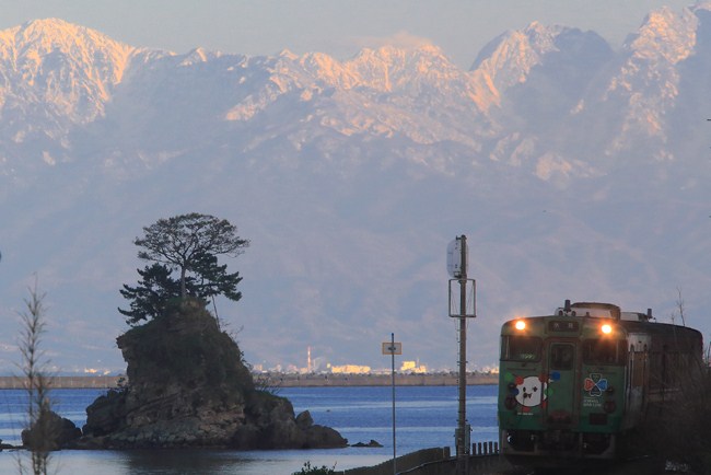 氷見に向かうため雨晴駅。越中国分方のホーム先端から下り列車を望遠で撮りました。構図に制約がありますが、なかなか迫力あるシーンになります。