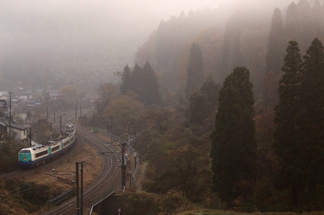倶利伽羅峠は、前日の雨の影響で、霧が立ち込める朝。紅葉もまずまずのようです。朝日が峠に入るまでにはまだまだ時間があり、トワイライトエクスプレスが通過する8時30分頃には、好条件の期待大です。まずは、楽しみの1つだった下り北越(485系)。この特急も無くなってしまうのかなぁ。