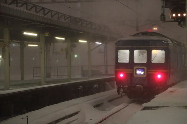 吹雪の中、定時の17時12分、上り北斗星、上野に向けて出発です。