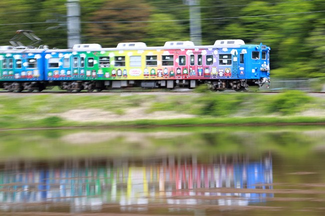 田起しも終わり、水が入った田んぼ。カラフルなトーマス電車は流し甲斐があります。