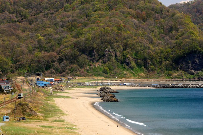 公園の階段を登ると、ちょうど、大岸駅をゆっくりと出発する下り列車。息が整わぬまま、とりあえずシャッターを切りましたが、意外にも素晴らしいローカル感。