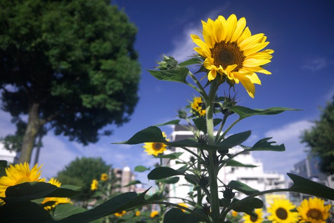 自宅最寄り駅の駅前は、向日葵の背丈も伸びてきました。そろそろ夏本番ですね。梅雨の花道 FIN.