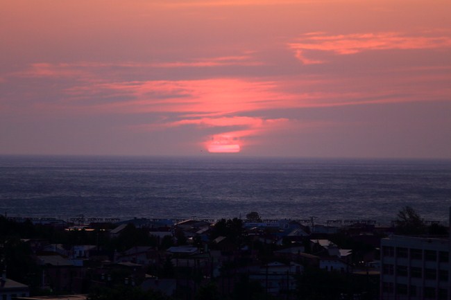 宗谷岬から天北線の線路を辿るように、浜頓別を経由して、旧興浜北線の終点駅「北見枝幸」があった枝幸町に泊りました。ここは蟹と帆立の漁獲では日本有数の町。夕餉は蟹ずくしでした。翌朝、4時前に目を覚まし、オホーツク海から昇る朝日を拝みました。
