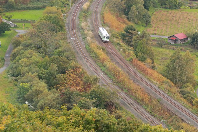 運転中、窓を開けると心地よい風。気の向くままに豊浦展望台へ、秋色になった複線が見えました。