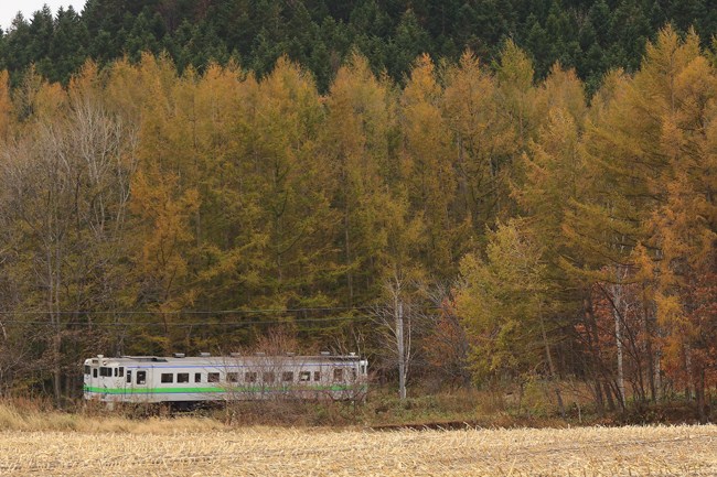 色づき始めた落葉松の林間をいく普通列車。北海道の秋は、落葉樹の紅葉が終わると、次は落葉松の黄葉と、2度紅葉が楽しめます。