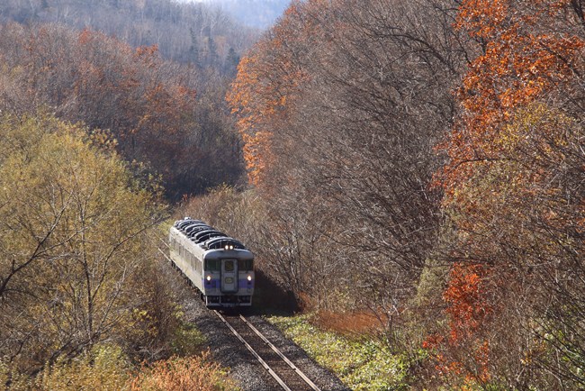 オホーツク1号がやってくるタイミングで、久しぶりに丸瀬布の直線。ここは紅葉がまだ残っていました。スラントノーズは後ろ側ですので、白ぼうずでも来てくれたらなぁと構えたら、ホントに来てくれました。この顔、まともに撮ったのは始めてです。