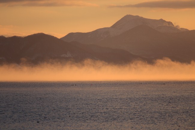 気嵐が、朝日に輝きます。バックは有珠山。 雨晴海岸で見た立山バックの気嵐の和風な雰囲気も良いですが、こちらは只々雄大な眺めでした。