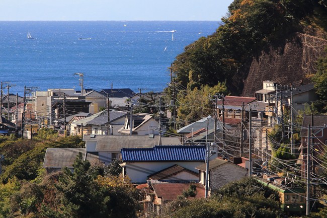 海が青く見える日は、坂を登って高いところから。少し左に三原山(大島)が見えるとですが、江ノ電と両方を入れるのは難しい感じです。