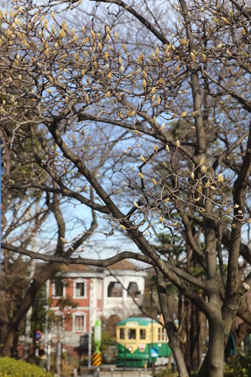 一つ目6000系が佇む荒川遊園地。ハクモクレンの蕾が膨らんでいました。